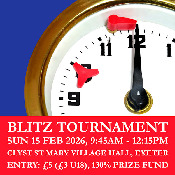 Fans of blitz chess will be pleased to hear that an Individual Blitz tournament will be taking place at Clyst St Mary Village Hall (Clyst St Mary, Exeter, EX5 1AA) on the morning of Sunday 15 February 2026 (9:30am-12:15pm), prior to the DCCA Team Quickplay tournament (which takes place in the afternoon at the same venue - see www.devonchess.org for details of how to enter a team of four).